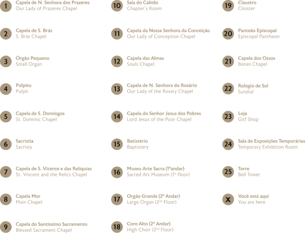A Sé de Faro alberga um extraordinário conjunto de capelas barrocas e góticas, cada uma com a sua história única e tesouros artísticos. Ao longo dos séculos XVII e XVIII, bispos e confrades enriqueceram este espaço sagrado com retábulos de talha dourada, azulejos polícromos e imaginária de rara beleza.